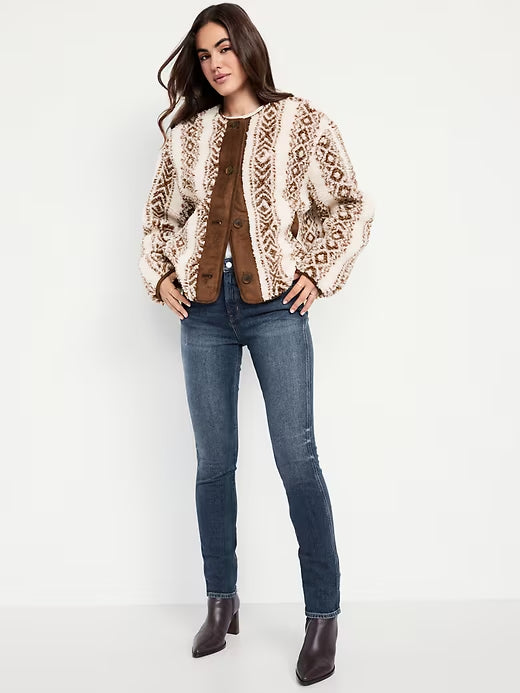 - Full-button sueded placket