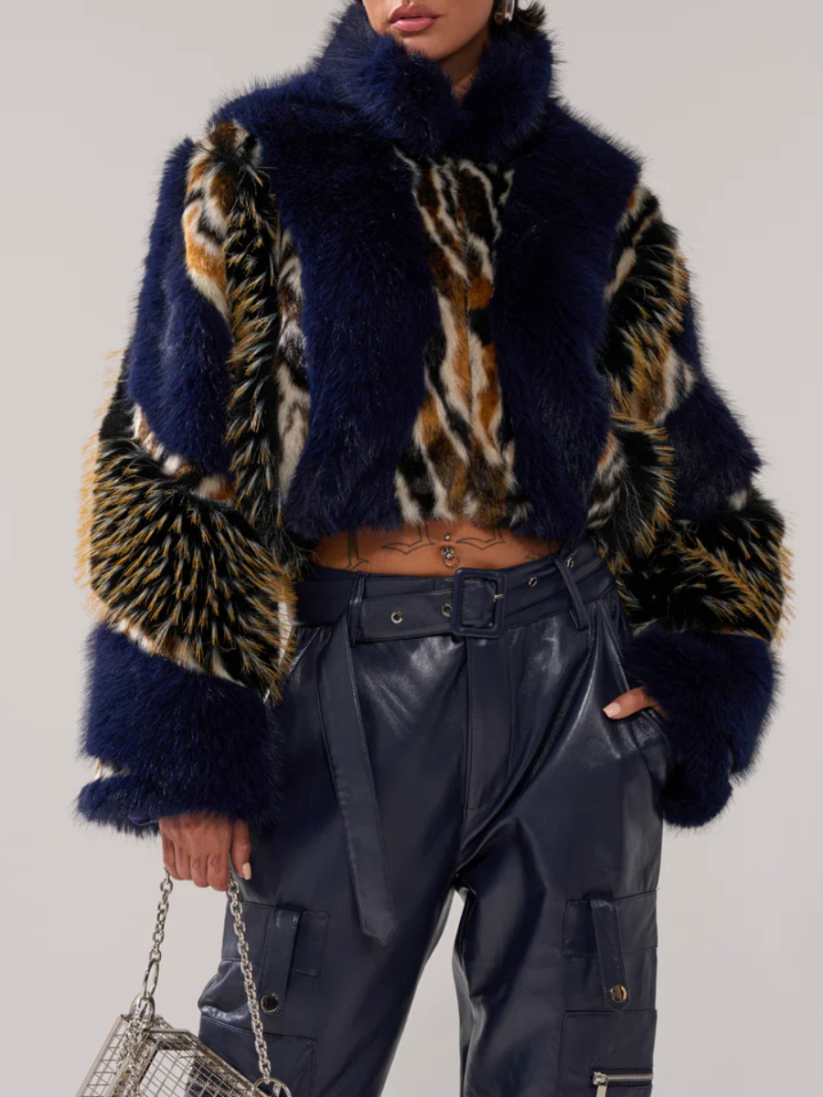 We’re wild for this jacket designed in mixed animal printed faux fur. Cropped faux fur jacket in a boxy fit featuring a high stand collar, long sleeves, side seam pockets and hook-and-eye closures down the front perfect for topping off any of your cold weather outfit ideas.