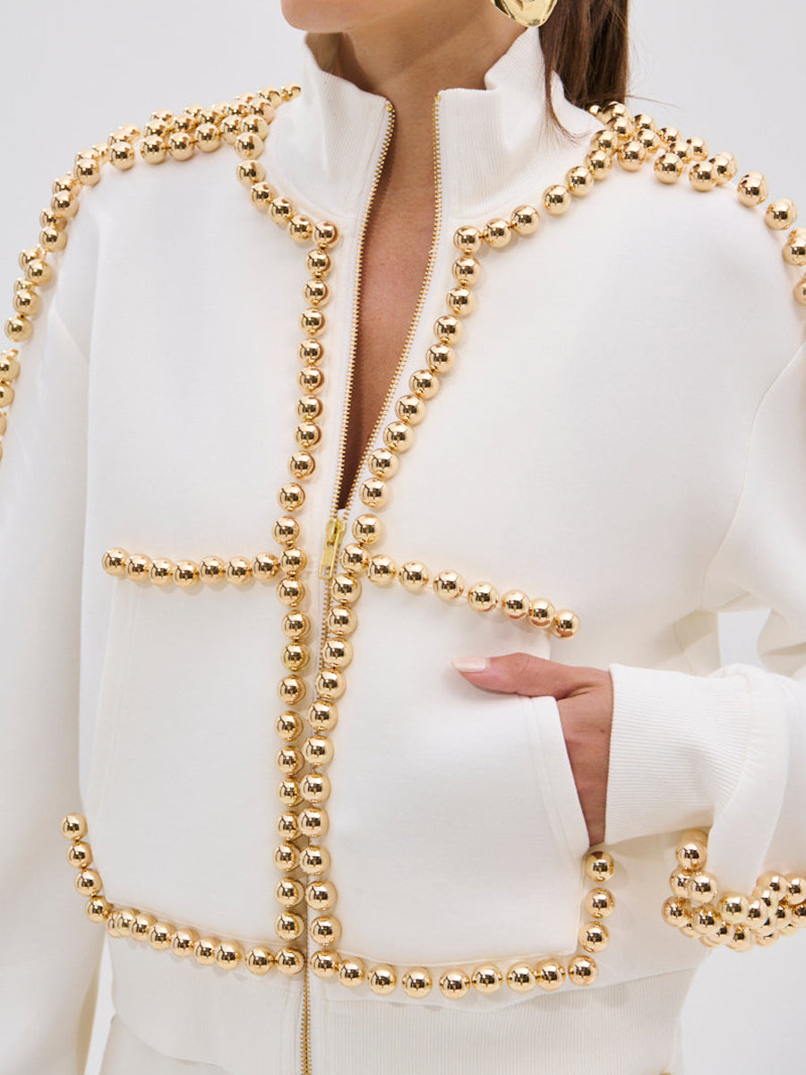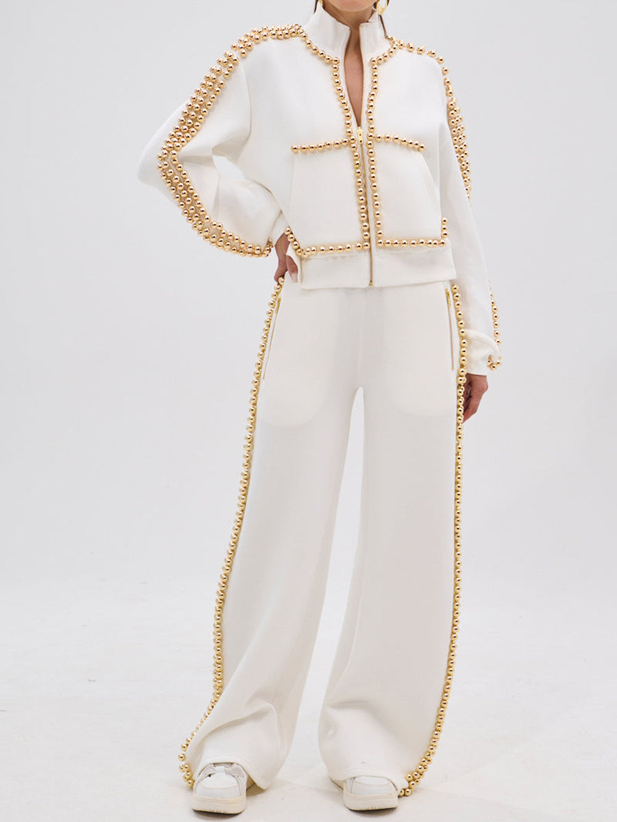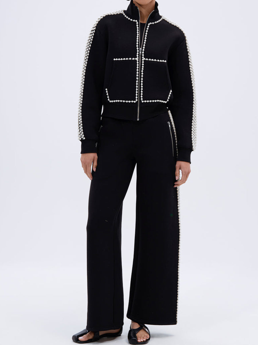 Crafted from a soft and stretchy, heavyweight knit blend, this statement jogger features a high-rise elastic waistband, zippered side-seam pockets, and metallic gold-tone ball embellishments that trail from hip to hem. Complete with a relaxed, wide-leg silhouette.